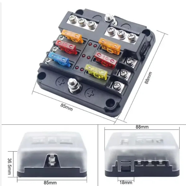 The 12-Way Fuse Block is the ideal choice for organized and reliable power distribution from your positive terminal, with dimensions of 138(h)x85(w)x37(d).