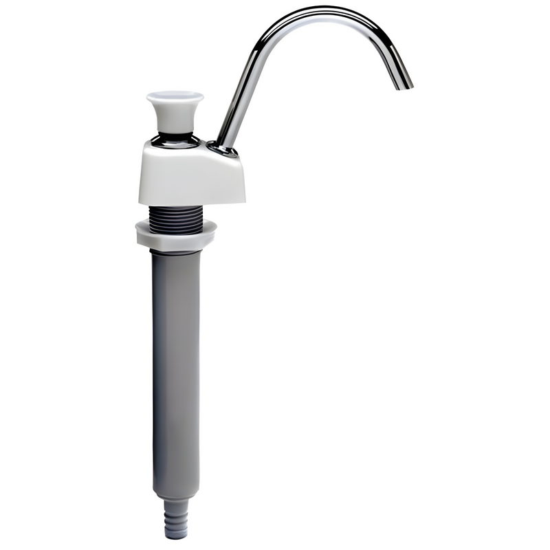 High quality. Double action. Takes up little space. Very reliable. Chromed brass spout for salt or freshwater usage. Available in black, grey or white.