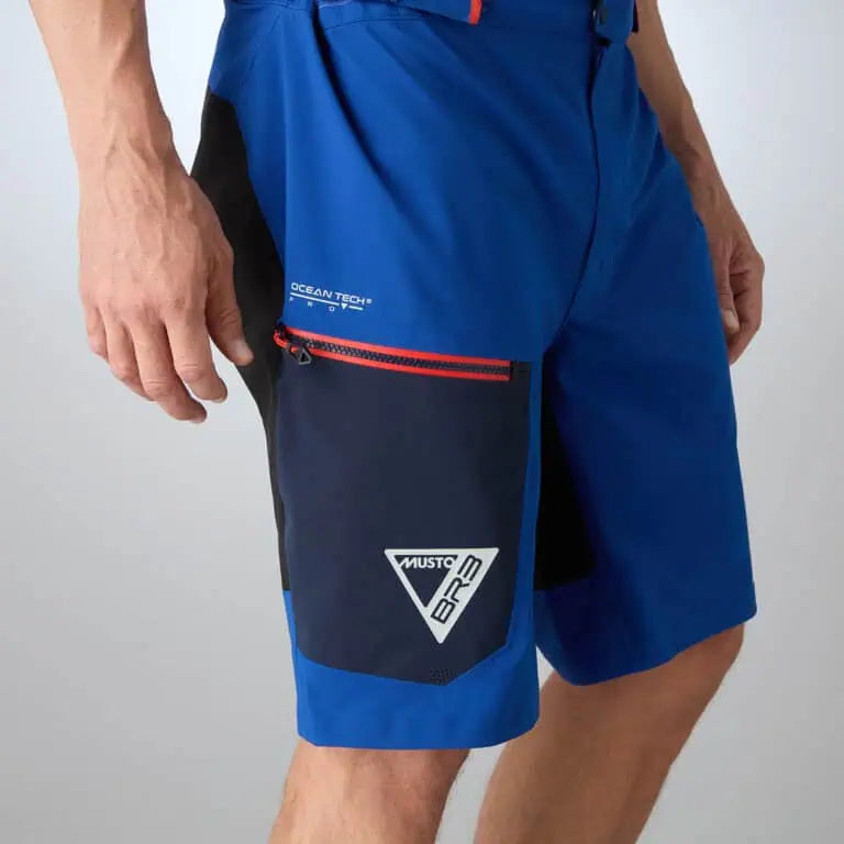 Made with Musto's high-performance Ocean Tech™ Pro fabric, these Men's BR3 Sport Shorts are built for the avid sailor. The seat is reinforced with abrasion resistant fabric for durability and added protection against abrasive deck surfaces. You can achieve a secure custom fit using the elasticated hook and loop tabs to each side of the high-backed waistband, which is designed to protect against windchill while simultaneously ensuring modesty during on-board tasks. A deep thigh pocket with a YKK® zipper is located on the right-hand side for secure storage.