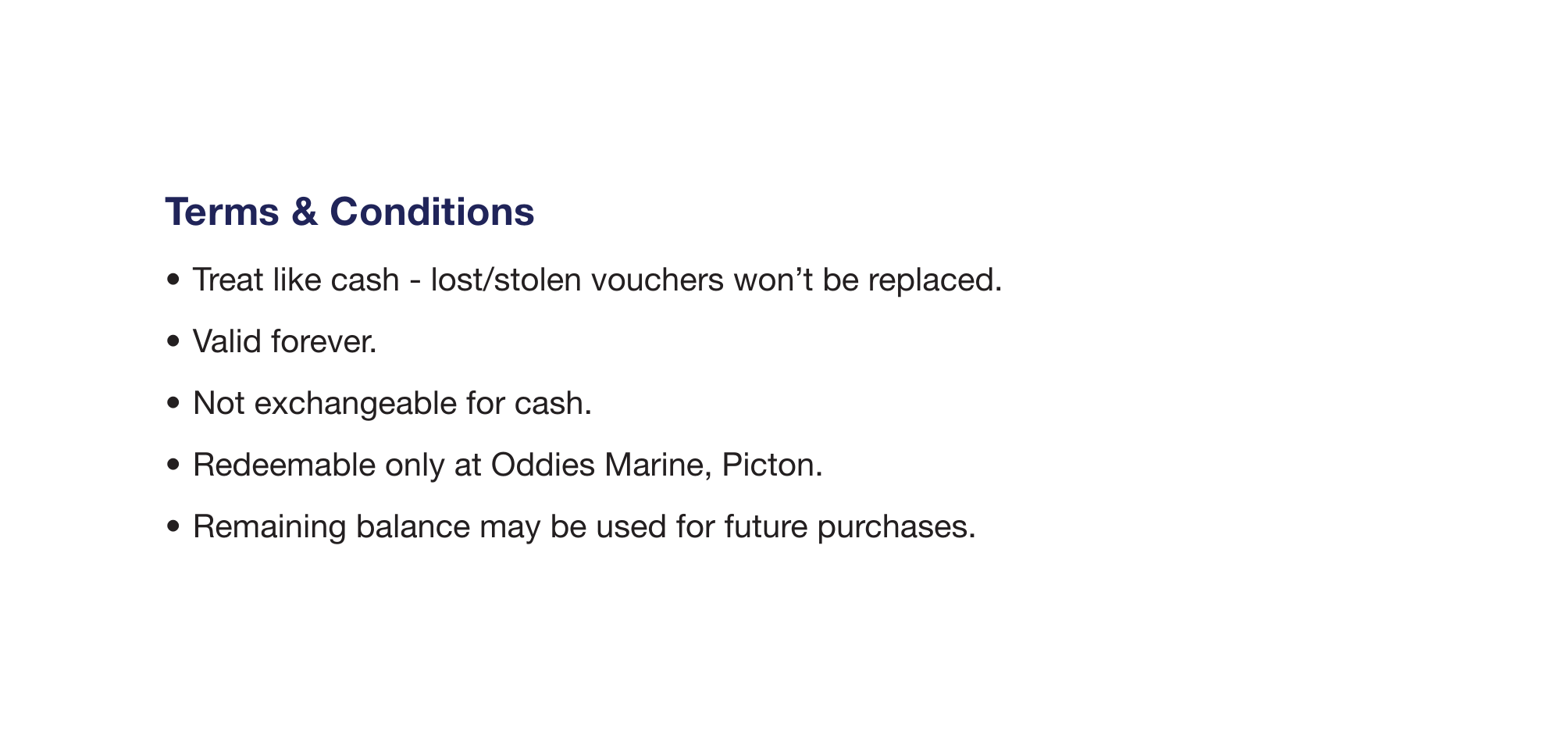 Give the perfect gift for any boating enthusiast with an Oddies Marine Waikawa Gift Voucher. Available in handy denominations of $20, $30, $50, $80, $100, and $200 – or choose a custom amount to suit your needs. Whether it’s for essential chandlery supplies, specialist marine gear, or something unique from our Waikawa store, these vouchers make shopping simple and thoughtful. Easy to redeem in-store, they’re the ideal way to support local while letting your recipient pick exactly what they want.